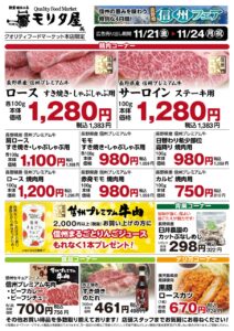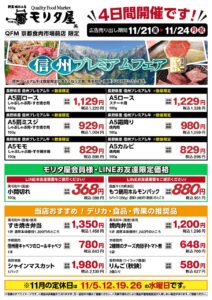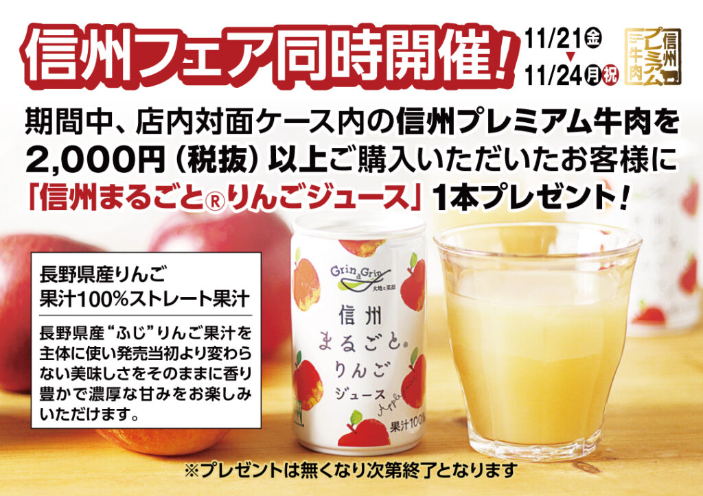 「週末セール情報 4日間開催 信州フェアも同時開催」 2025-11-20 チラシ(SUINA室町店) 「2025年11月21日(金)~11月14日(月・祝) 4日間限定のお買得情報!」さらに「信州フェア「信州まるごとりんごジュース」プレゼント